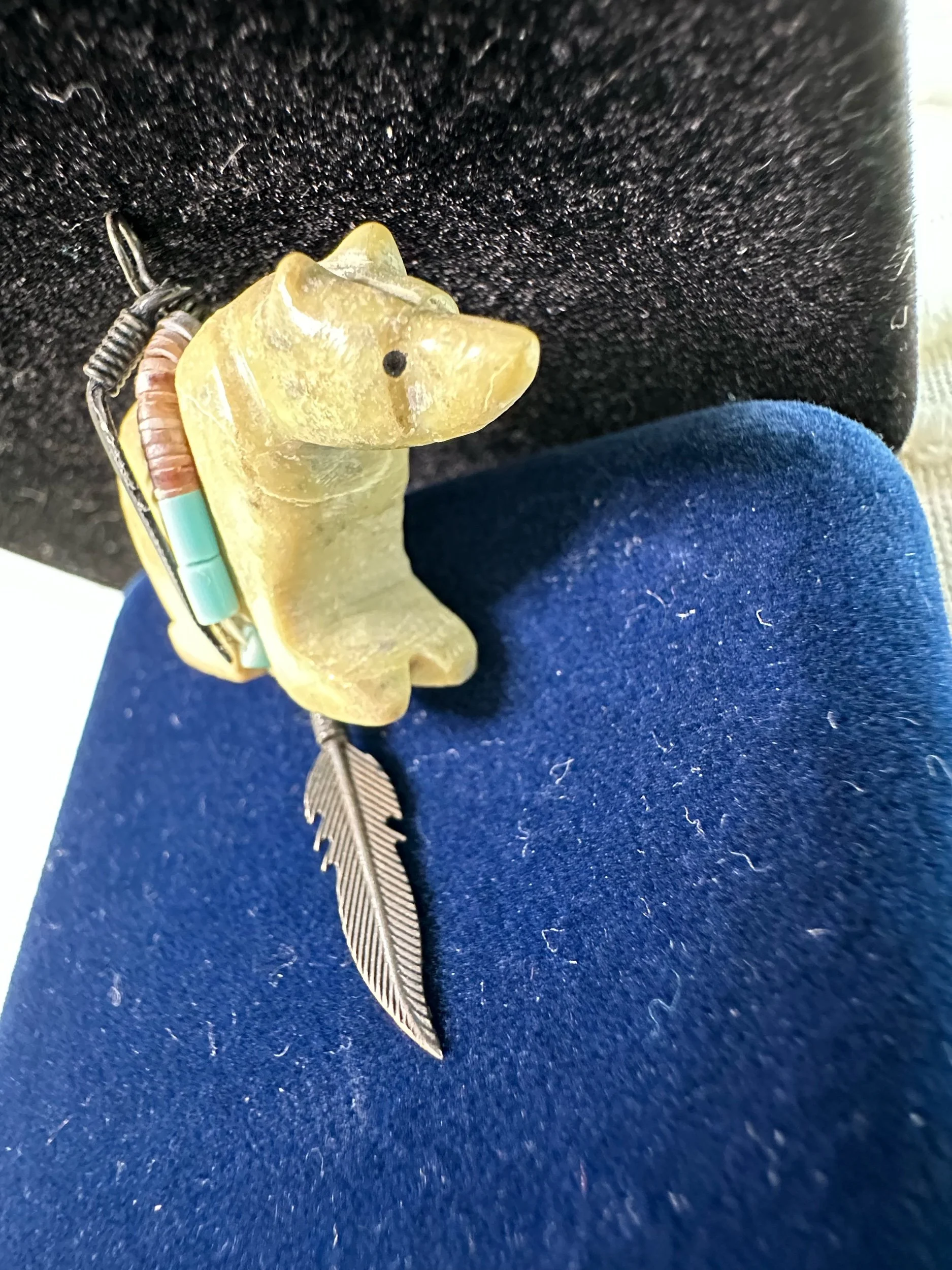 A striking blend of earth and tradition, the Carved Jasper Bear Pendant Wrapped Turquoise & Coral Heishi with Sterling Feathers showcases a hand-carved jasper bear—its warm, variegated tones brought to life by a skilled artisan—and is accented with wrapped turquoise and coral heishi beads that add vivid color and cultural resonance. The pendant is framed with delicate sterling silver feather details, lending movement and a subtle shine that complements the stone’s organic texture. Thoughtfully balanced in scale, this piece wears comfortably as a focal pendant and pairs well with both casual and elevated looks. Rooted in Native American design influences, it reflects authentic craftsmanship and meaningful symbolism, making it a wearable statement of nature, protection, and timeless style.