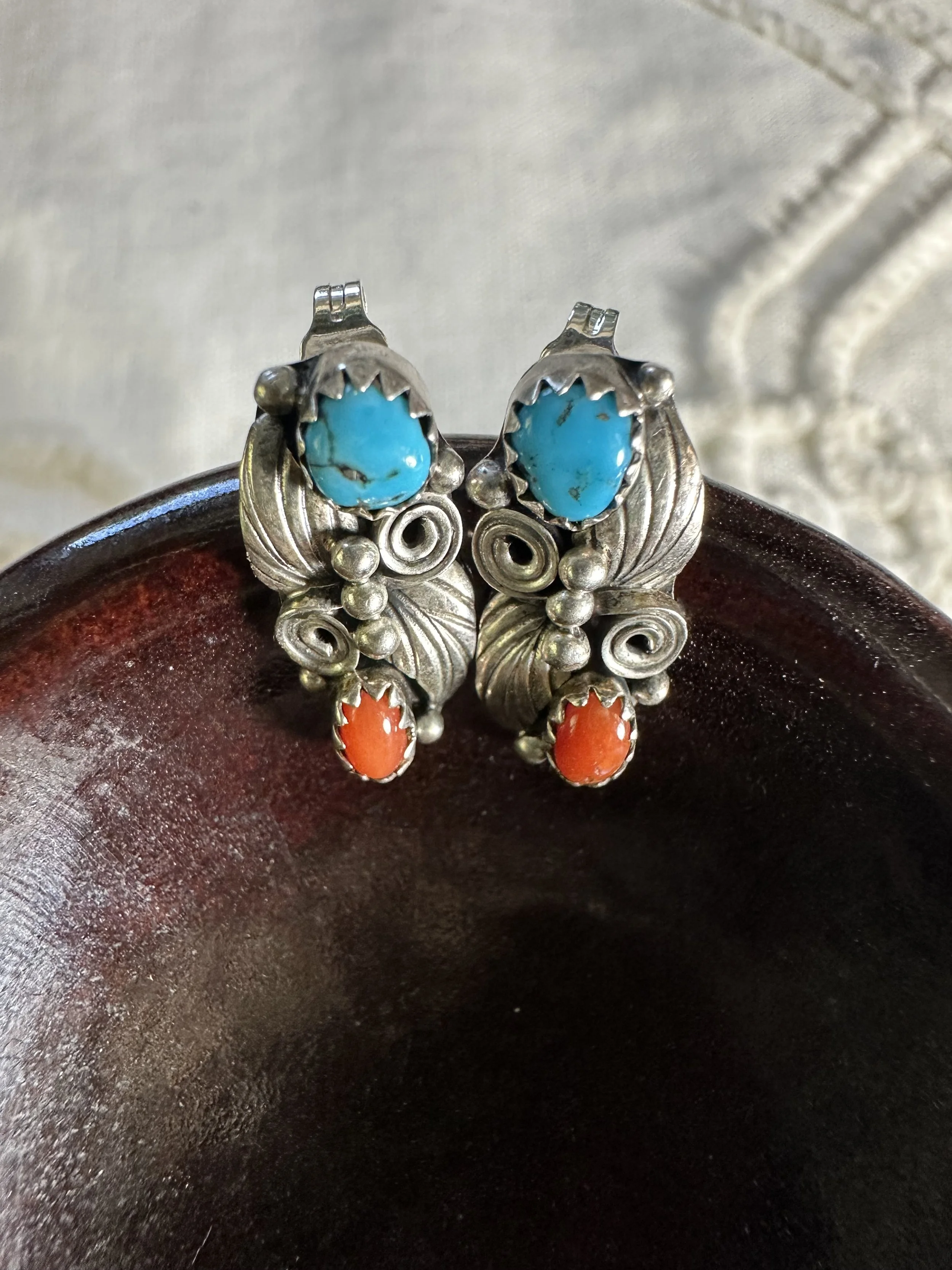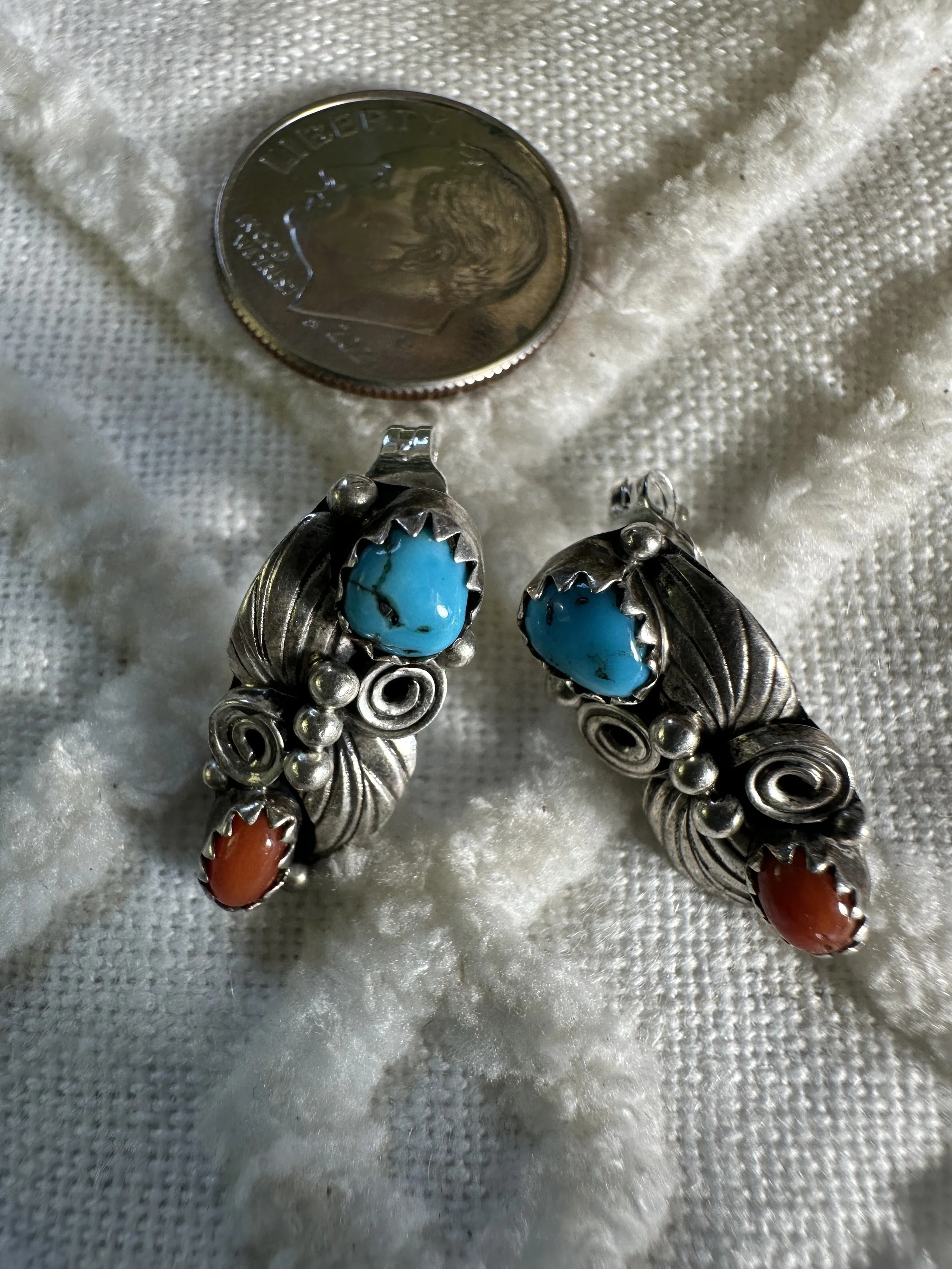 Reversible Vintage Sterling Silver Pendant with Coral & Turquoise Stones