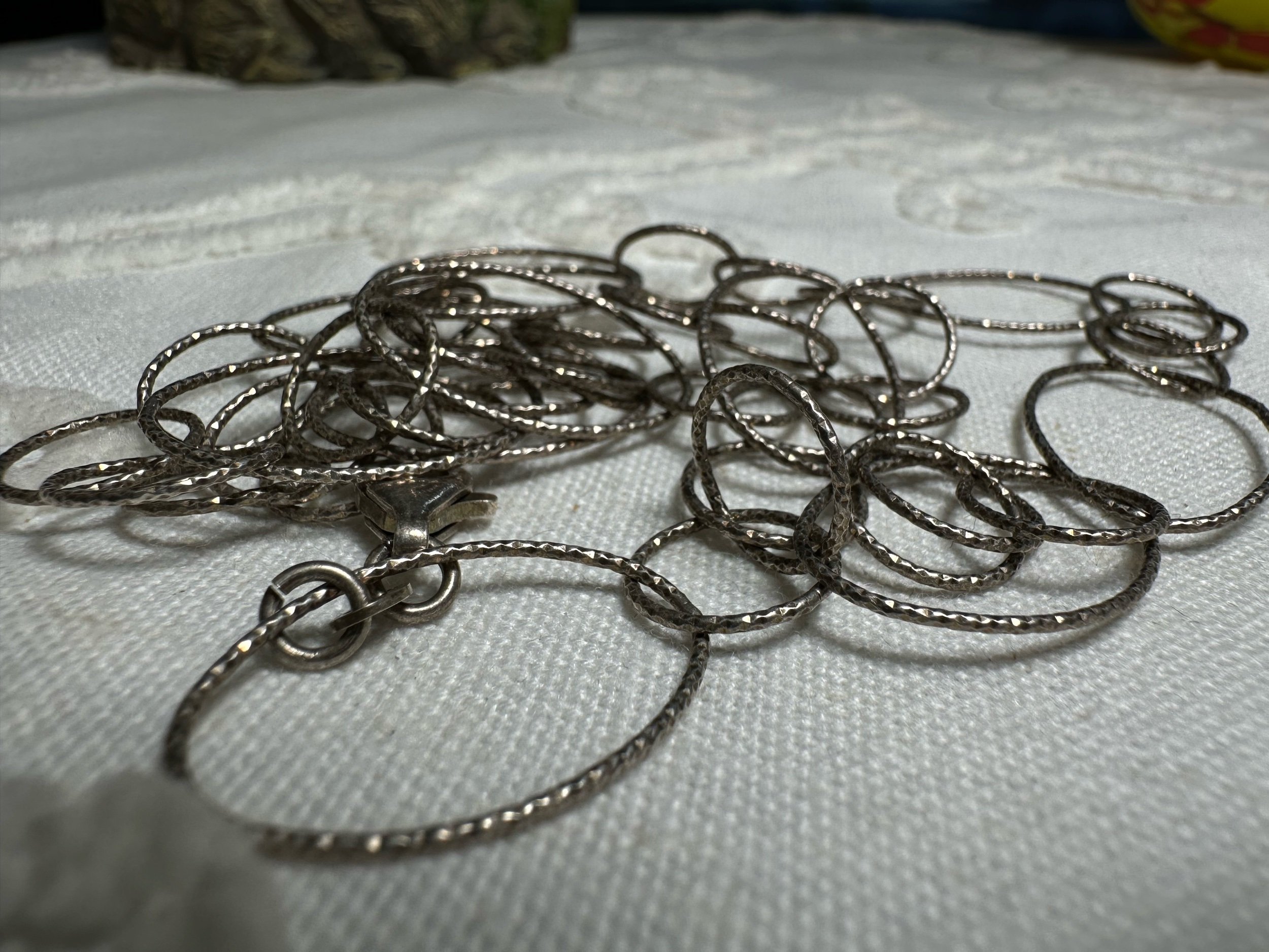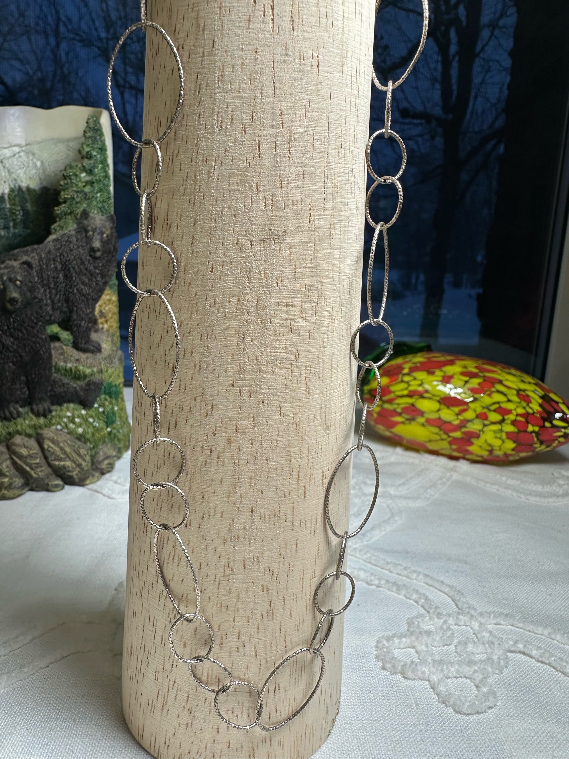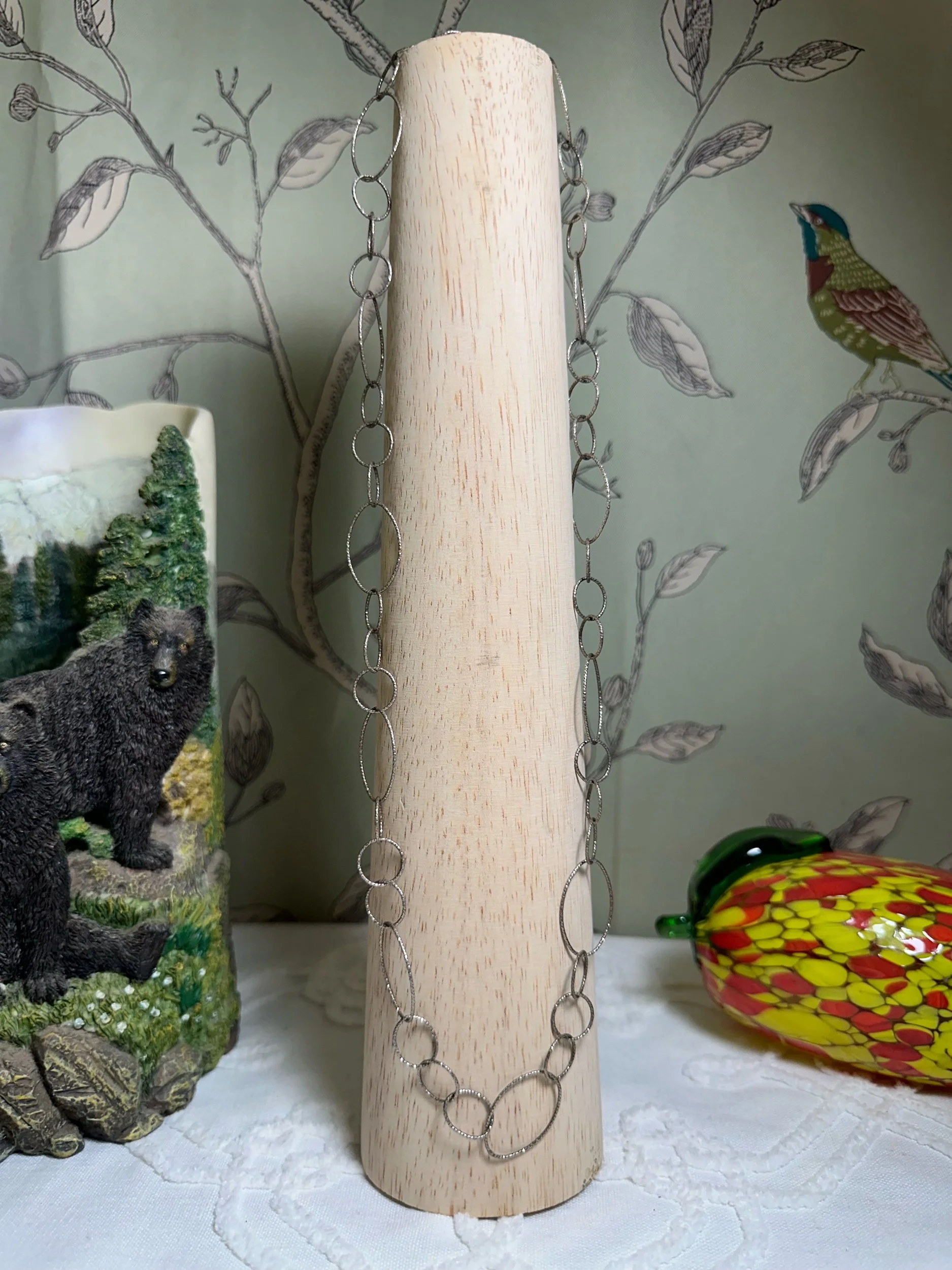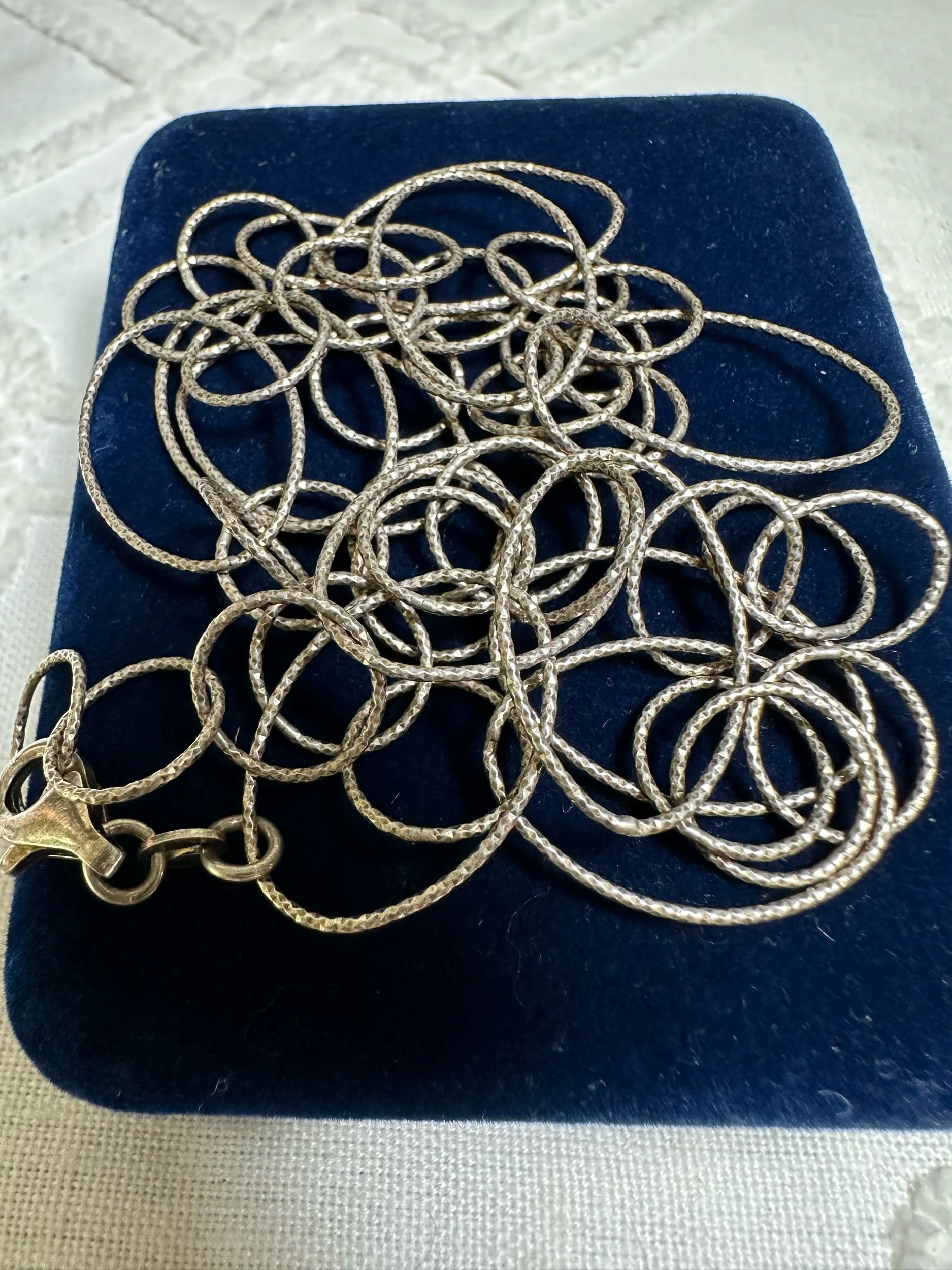 Textured & linked sterling silver chain blends tactile detail with timeless structure, offering a versatile accessory that complements both vintage Native American pieces and modern wardrobes. Each link is carefully crafted and often hand-textured—hammered, brushed, or oxidized—to enhance visual depth and catch light in subtle ways, while the interlinked design provides strength and fluid movement. The sterling silver base ensures lasting luster and hypoallergenic wear, and the combination of texture and link styles allows these chains to be worn alone as a statement or layered with pendants and other necklaces for a curated, personal look. Whether paired with hand-selected gemstones or worn simply, a textured and linked sterling chain conveys artisanal quality and enduring elegance.
