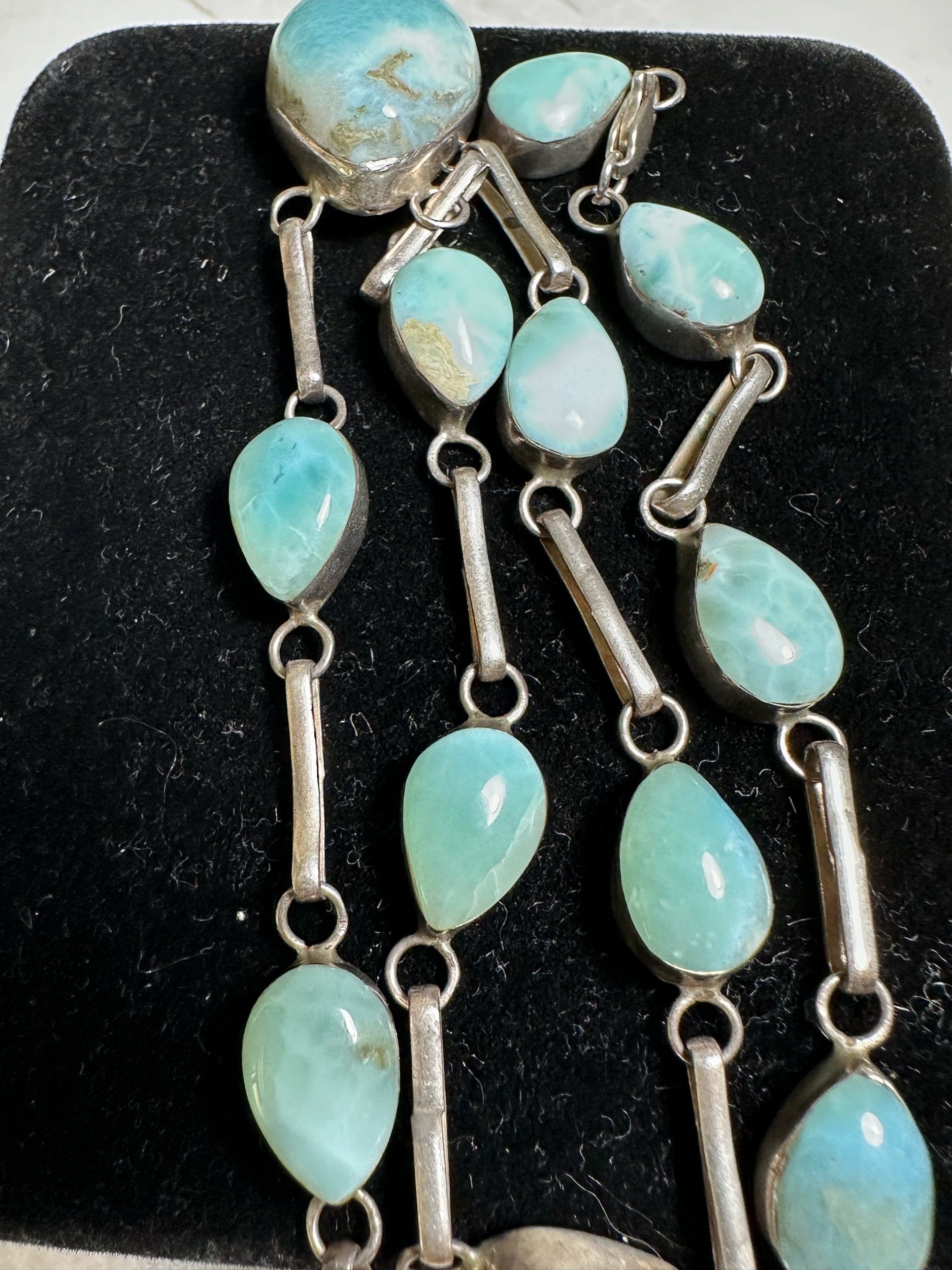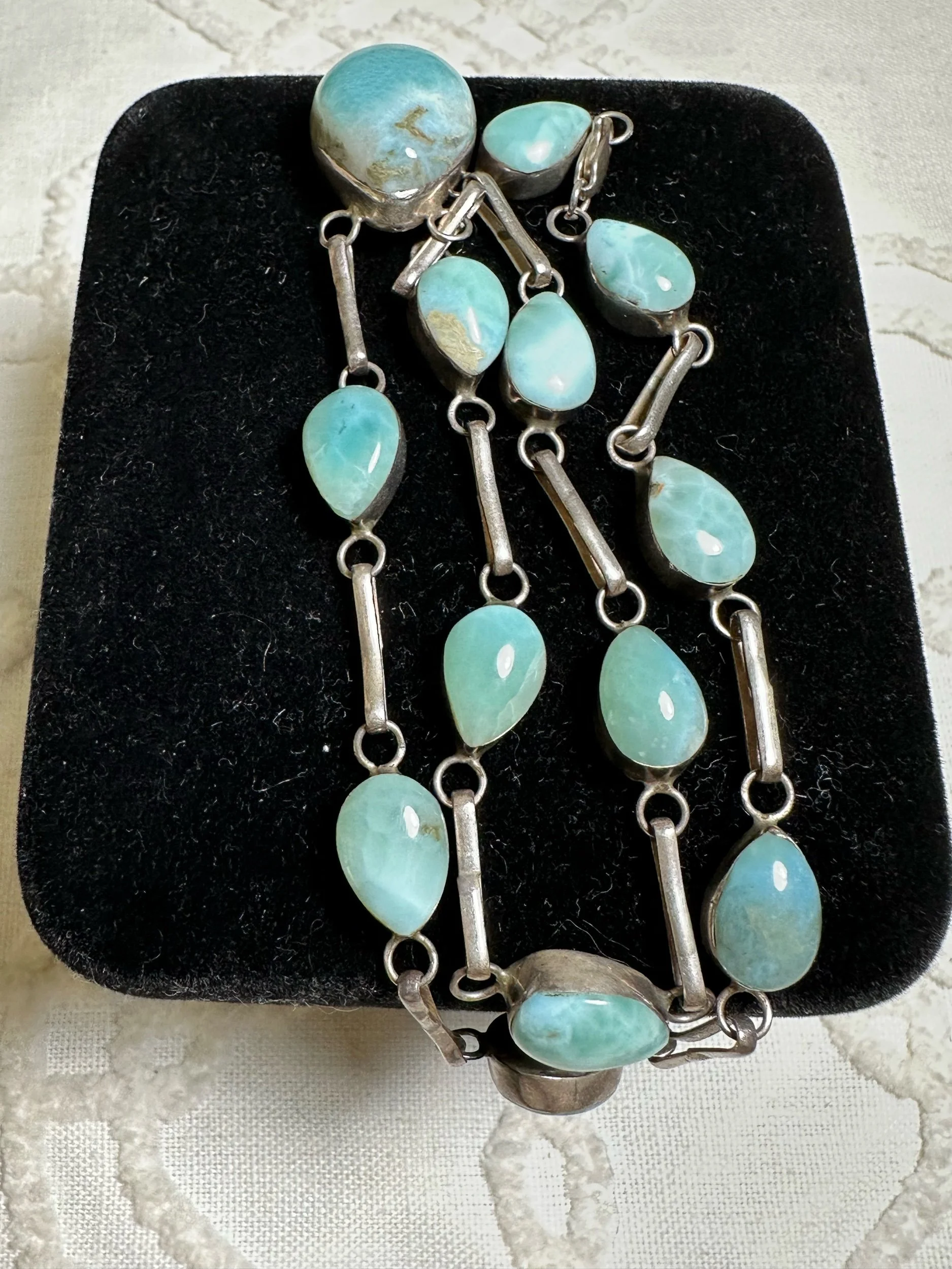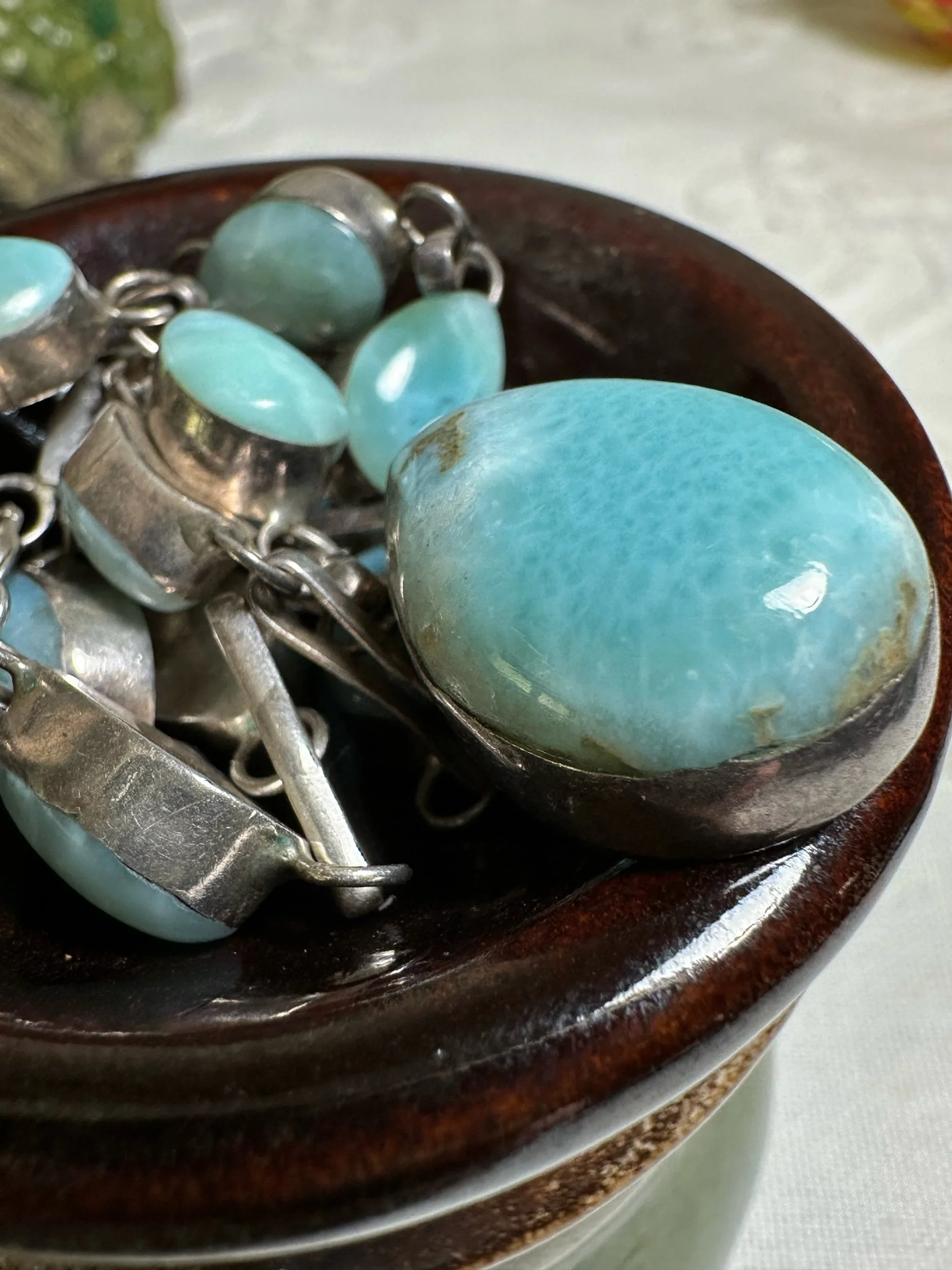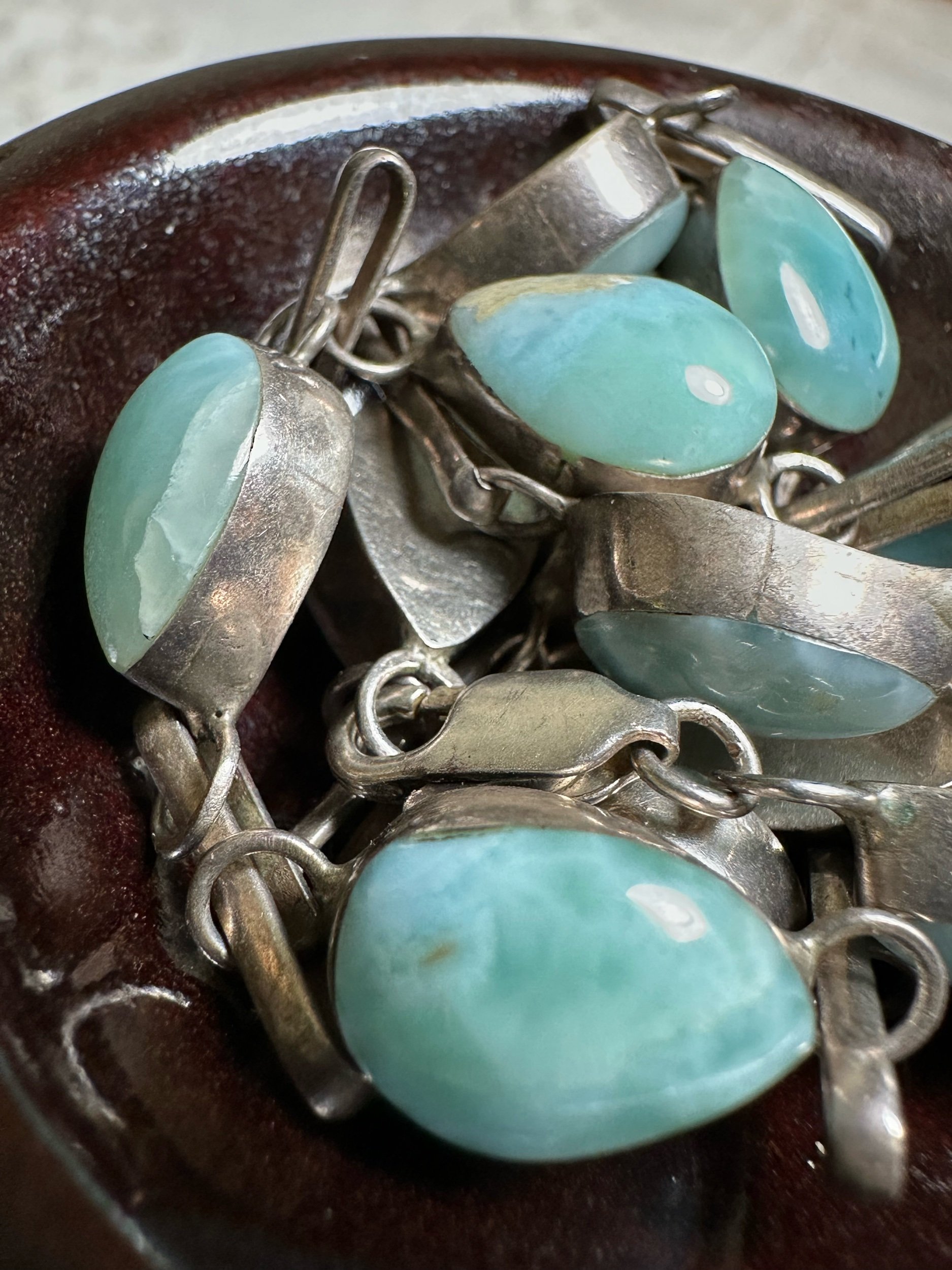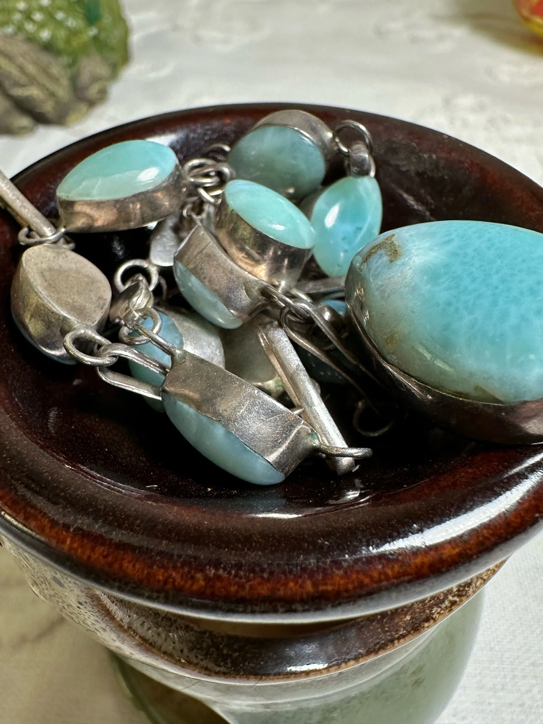 The Multi Stone Larimar Sterling Silver Necklace features a graceful arrangement of polished larimar cabochons set in genuine sterling silver, each stone exhibiting the sea‑blue and white marbling unique to larimar. Handcrafted with attention to balance and movement, the necklace combines multiple sizes of larimar to create visual depth, while the sterling settings provide a bright, durable contrast that highlights the stones’ natural patterns. Lightweight yet substantial, the piece is finished with a secure clasp and a versatile length that layers well or stands alone as a statement, making it an elegant choice for those who appreciate artisanal craftsmanship and the calming aesthetic of Caribbean‑inspired gemstones.