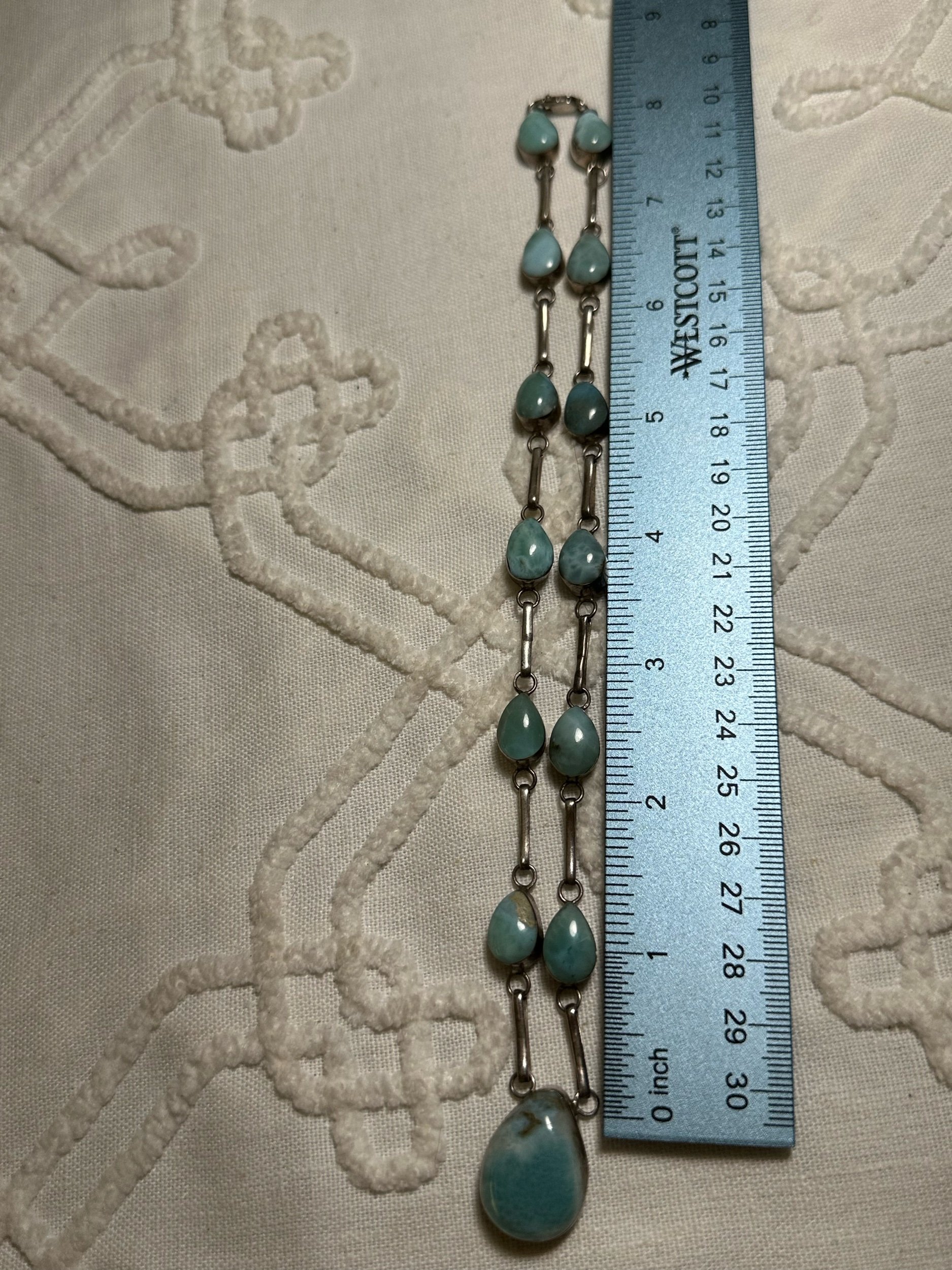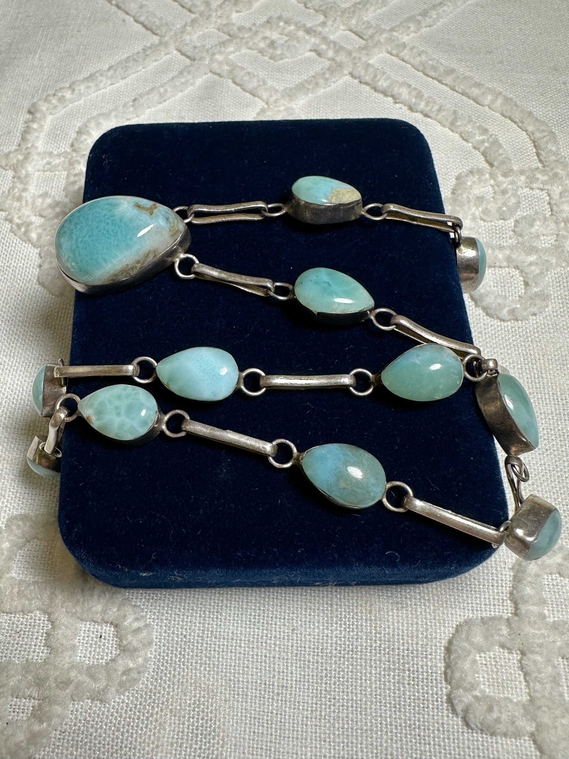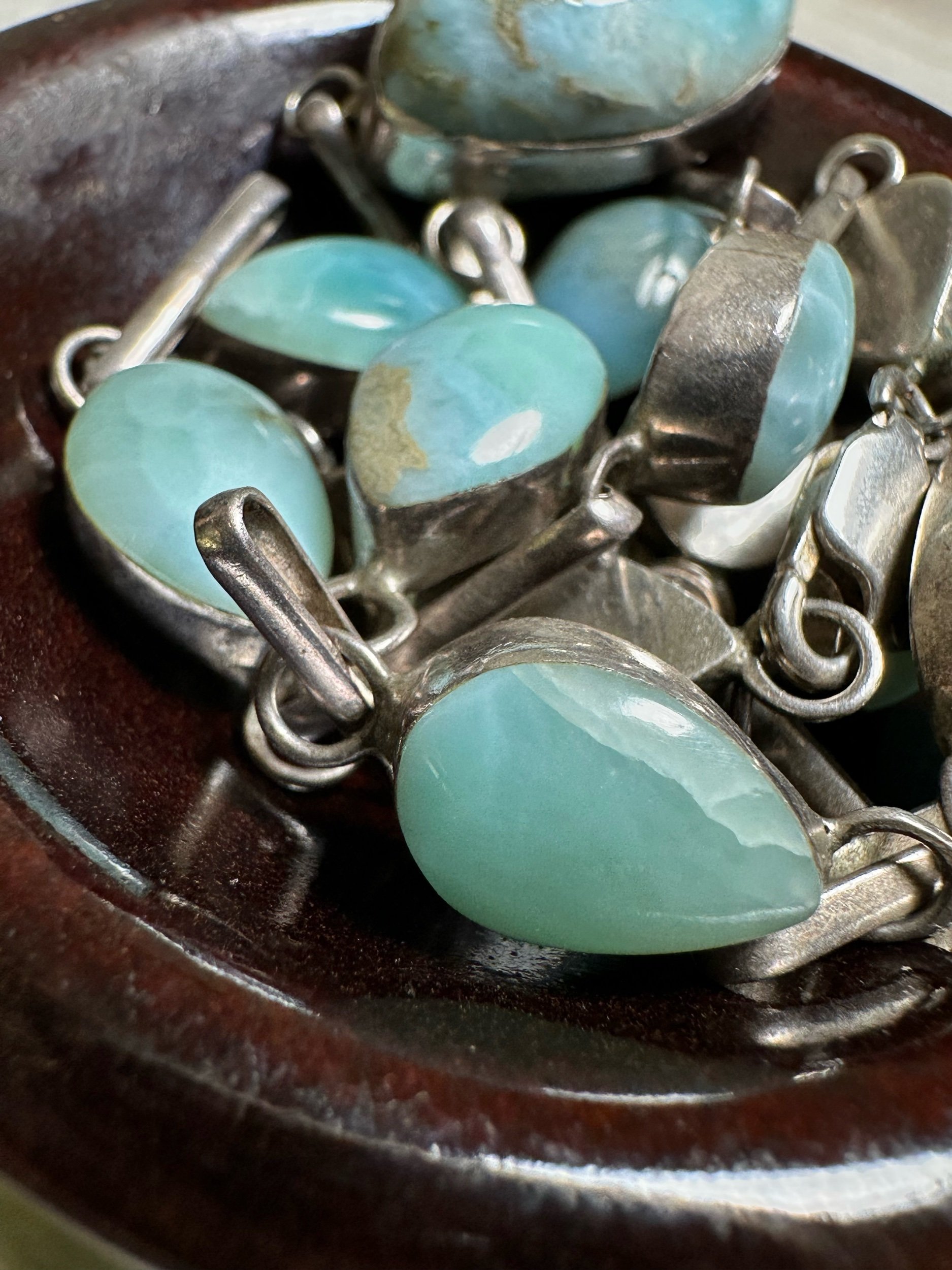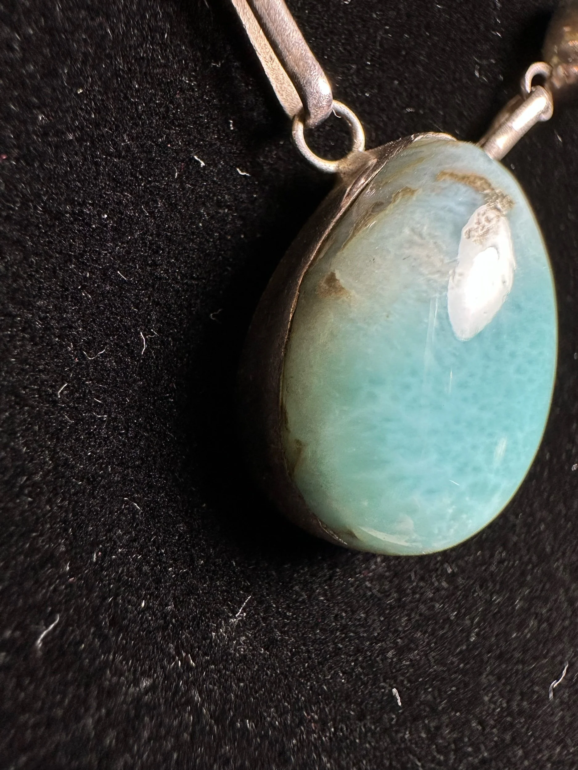 The Multi Stone Larimar Sterling Silver Necklace features a graceful arrangement of polished larimar cabochons set in genuine sterling silver, each stone exhibiting the sea‑blue and white marbling unique to larimar. Handcrafted with attention to balance and movement, the necklace combines multiple sizes of larimar to create visual depth, while the sterling settings provide a bright, durable contrast that highlights the stones’ natural patterns. Lightweight yet substantial, the piece is finished with a secure clasp and a versatile length that layers well or stands alone as a statement, making it an elegant choice for those who appreciate artisanal craftsmanship and the calming aesthetic of Caribbean‑inspired gemstones.