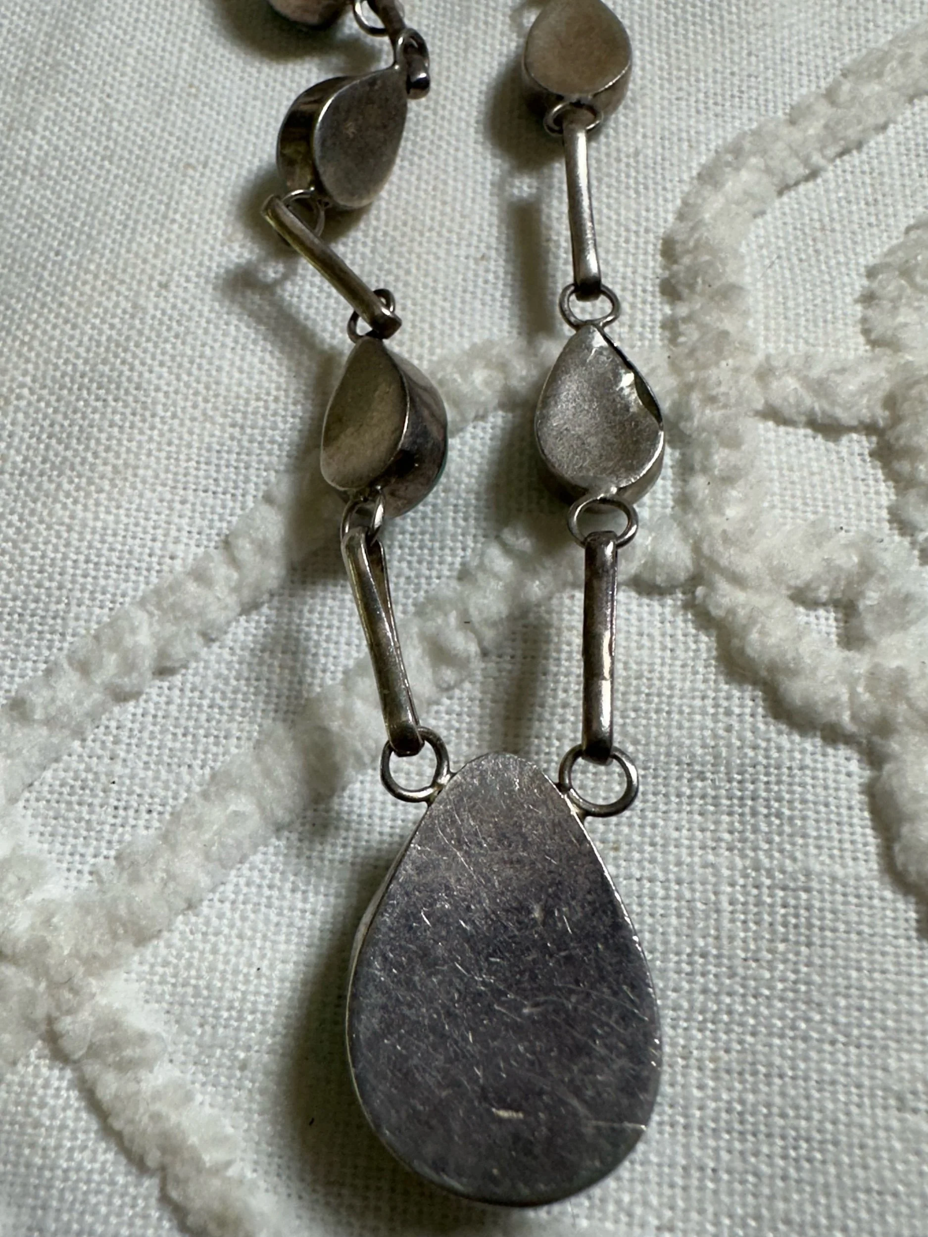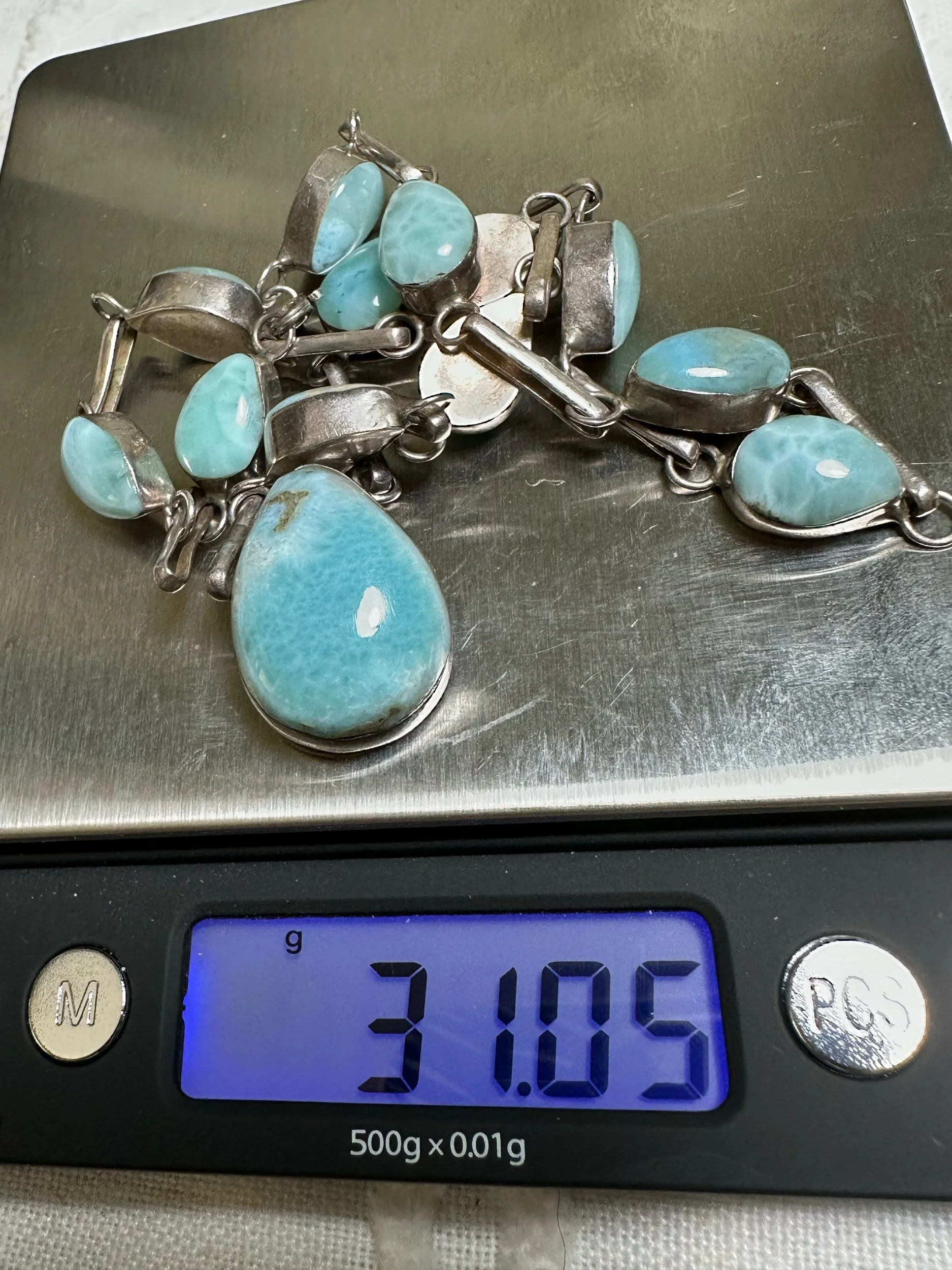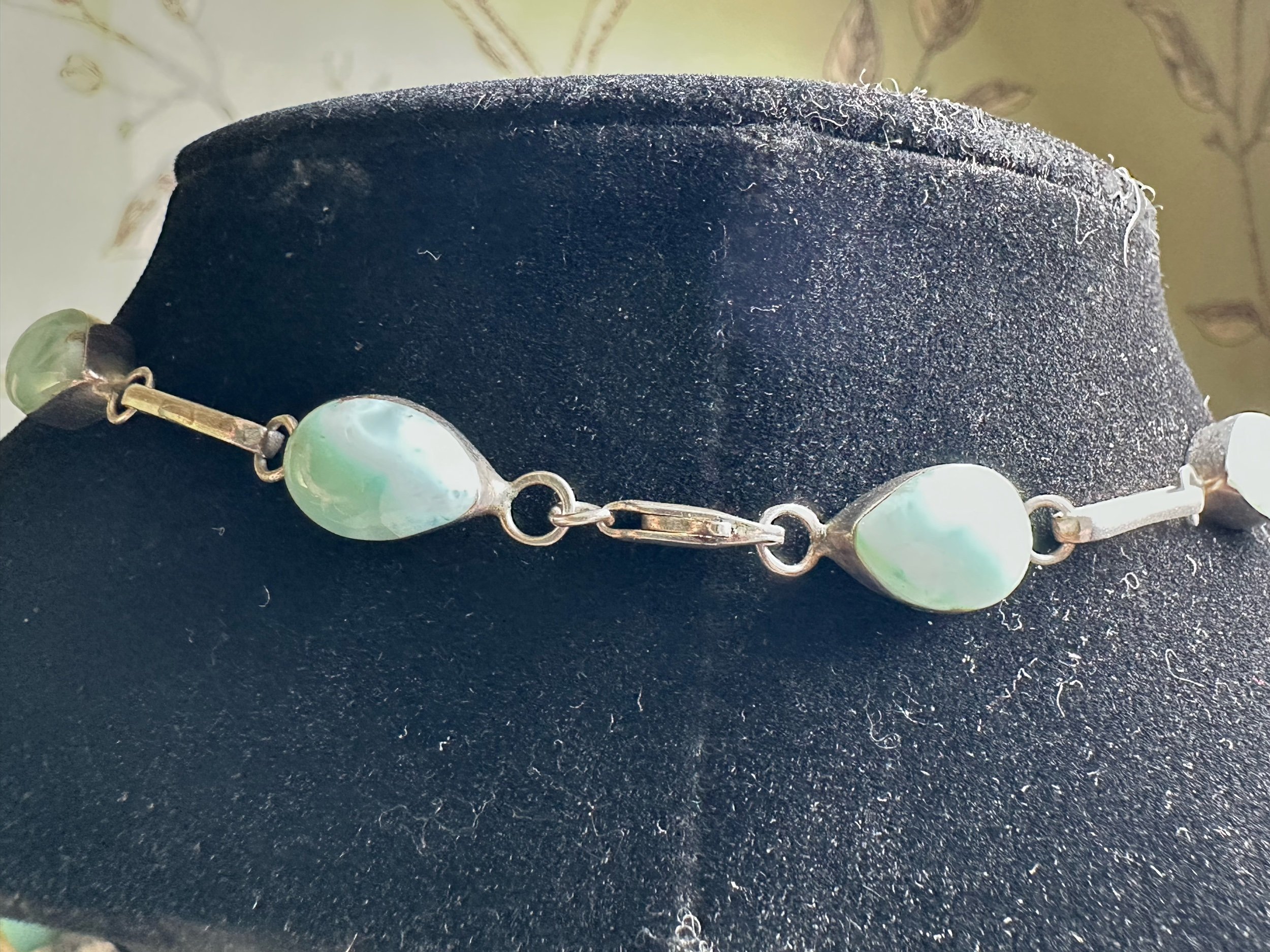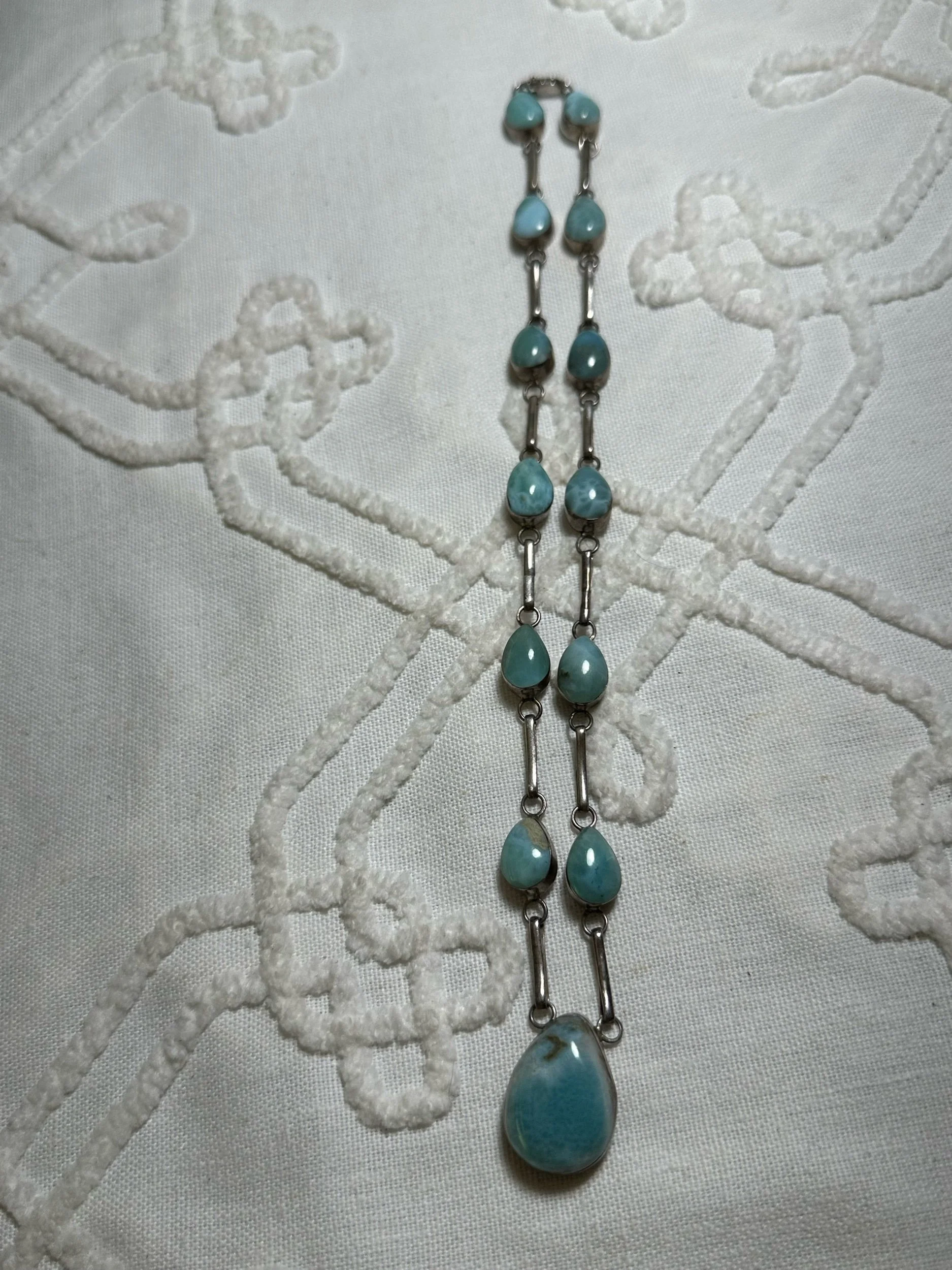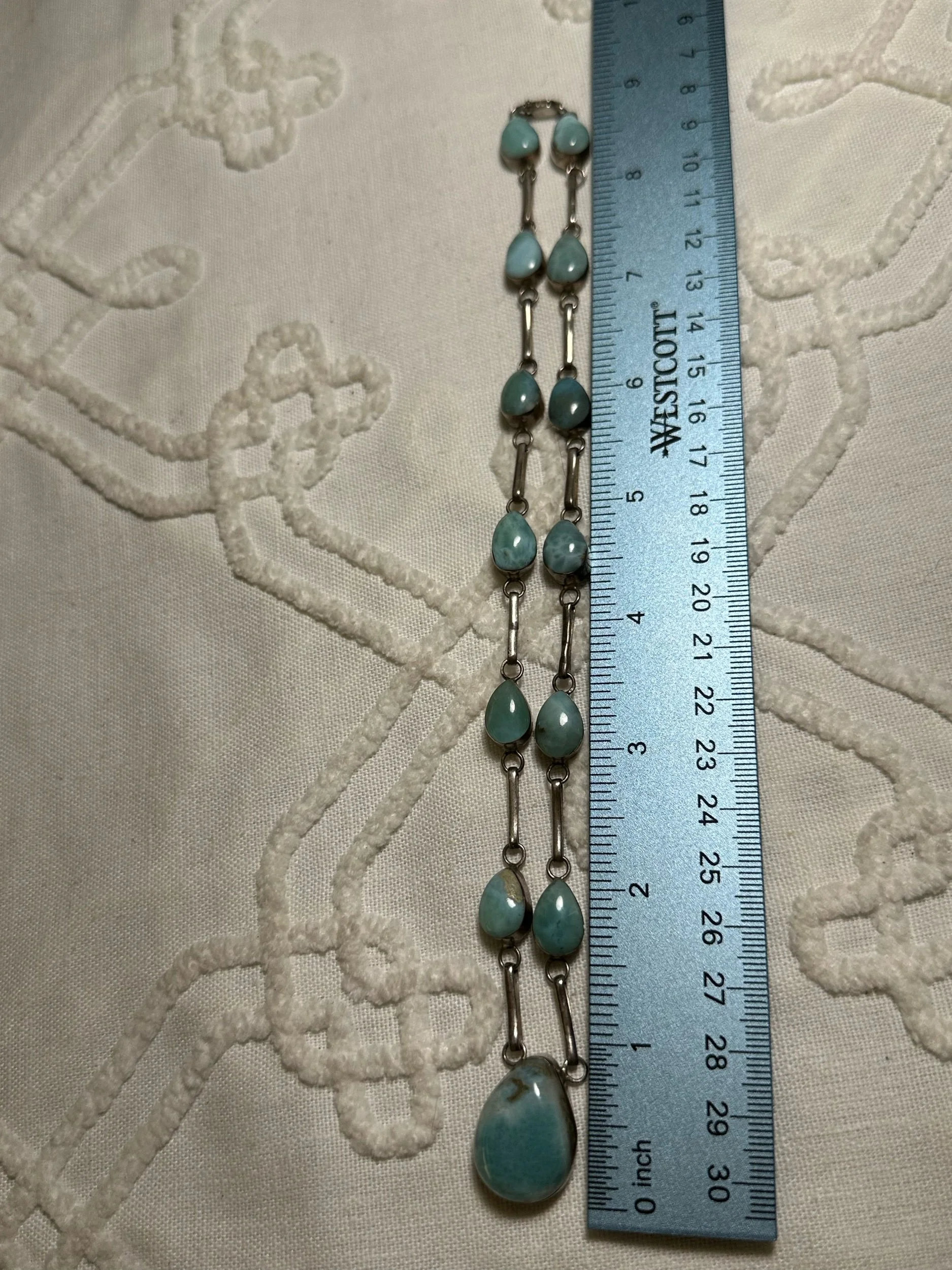 The Multi Stone Larimar Sterling Silver Necklace features a graceful arrangement of polished larimar cabochons set in genuine sterling silver, each stone exhibiting the sea‑blue and white marbling unique to larimar. Handcrafted with attention to balance and movement, the necklace combines multiple sizes of larimar to create visual depth, while the sterling settings provide a bright, durable contrast that highlights the stones’ natural patterns. Lightweight yet substantial, the piece is finished with a secure clasp and a versatile length that layers well or stands alone as a statement, making it an elegant choice for those who appreciate artisanal craftsmanship and the calming aesthetic of Caribbean‑inspired gemstones.